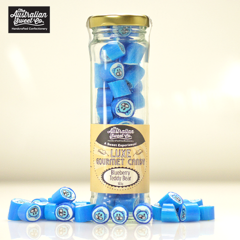 Handcrafted and blue on the outside with a blue teddy in the centre and a delicious blueberry flavour